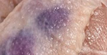 You pull your chicken breasts out of the fridge, ready to start dinner, and then you notice it—dark purple blotches…