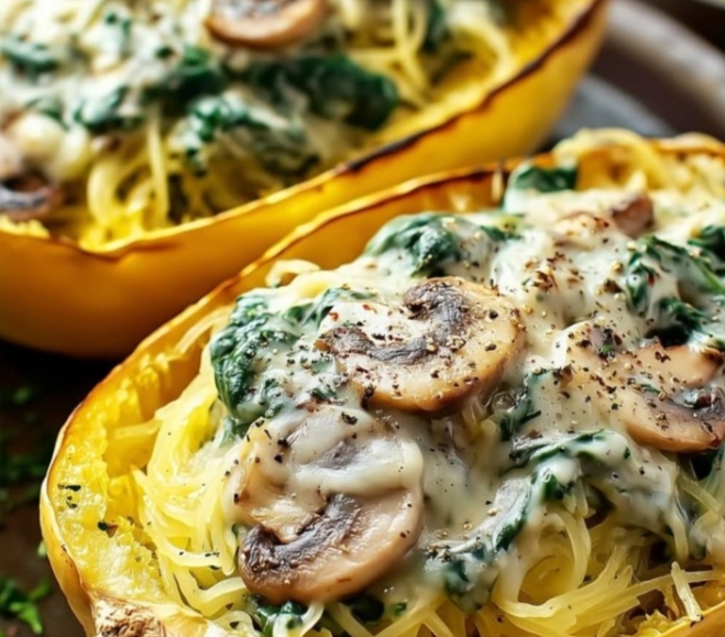 IngredientsFor the Squash:1 large spaghetti squash1 tablespoon olive oilSalt and pepper, to tasteFor the Filling:1 tablespoon olive oil1 small onion, finely chopped3 cloves garlic, minced8 oz (225 g) mushrooms, sliced (cremini or button work great)3 cups fresh spinach (or 1 ½ cups frozen, thawed and squeezed dry)½ teaspoon saltÂź teaspoon black pepperÂź teaspoon nutmeg (optional, for depth)½ cup heavy cream (or coconut cream for dairy-free)½ cup cream cheese or ricotta½ cup grated Parmesan or mozzarella (plus more for topping)InstructionsRoast the SquashPreheat oven to 400°F (200°C).Slice the spaghetti squash in half lengthwise and scoop out the seeds.Drizzle the insides with olive oil, season with salt and pepper.Place cut-side down on a parchment-lined baking sheet.Roast for 35â40 minutes, until the flesh is tender and easily shredded with a fork.Prepare the FillingIn a large skillet, heat 1 tablespoon olive oil over medium heat.Add onions and cook 2â3 minutes until soft.Add garlic and cook another 30 seconds.Add mushrooms and sautĂŠ until they release their juices and turn golden brown (about 6â8 minutes).Stir in spinach and cook until wilted (or warmed through if using frozen).Season with salt, pepper, and nutmeg.Make it CreamyLower the heat, then stir in cream, cream cheese (or ricotta), and Parmesan.Mix until everything melts together into a creamy sauce.Taste and adjust seasoning if needed.Combine & Bake (optional but delicious)When the squash is ready, scrape the flesh gently with a fork to create âspaghettiâ strands but leave them inside the shell.Divide the creamy mixture evenly into both halves and mix it a bit with the squash strands.Sprinkle extra cheese on top.(Optional) Return to the oven for 5â10 minutes, or broil for 2â3 minutes until the top is bubbly and golden.To ServeServe warm straight from the shell or scoop it out into bowls.Garnish with a sprinkle of extra Parmesan or a few chili flakes if you like a kick. đśď¸Would you like me to make it vegan or high-protein version too?