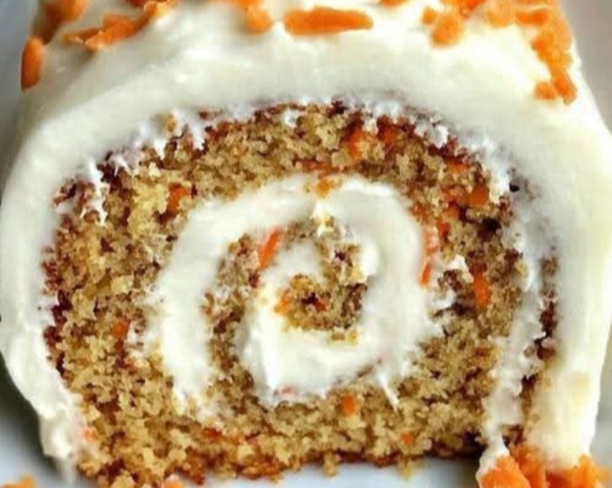 IngredientsFor the cake:3/4 cup all-purpose flour1 tsp baking powder1/2 tsp baking soda1/2 tsp cinnamon1/4 tsp nutmeg1/4 tsp salt3 large eggs1/2 cup granulated sugar2 tbsp brown sugar1 tsp vanilla extract2 cups finely grated carrotsFor the filling (cream cheese frosting):8 oz (225g) cream cheese, softened1 cup powdered sugar4 tbsp unsalted butter, softened1 tsp vanilla extractOptional topping:Extra cream cheese frostingShredded carrots or chopped nuts for garnishInstructionsPreheat the oven:Preheat to 350°F (175°C). Line a 10×15-inch jelly roll pan with parchment paper and lightly grease it.Make the batter:In a bowl, whisk together flour, baking powder, baking soda, cinnamon, nutmeg, and salt.In another large bowl, beat eggs, sugars, and vanilla until thick and light (about 2–3 minutes).Fold in the grated carrots, then gently fold in the dry ingredients until combined.Bake:Spread the batter evenly in the prepared pan. Bake for 10–12 minutes, until the cake springs back when touched.Roll the cake:While still warm, turn the cake out onto a clean kitchen towel sprinkled with powdered sugar.Carefully peel off the parchment paper, then roll the cake up in the towel (starting from the short side). Let it cool completely.Prepare the filling:Beat cream cheese, butter, powdered sugar, and vanilla until smooth and creamy.Assemble:Unroll the cooled cake gently. Spread the cream cheese filling evenly over it. Roll it back up (without the towel this time).Chill and decorate:Wrap in plastic wrap and chill for at least 1 hour.Frost the outside with extra cream cheese frosting and sprinkle with grated carrots or nuts if desired.🍰 TipsMake sure the cake is warm (not hot) when rolling, to avoid cracking.For added flavor, mix crushed pineapple or chopped walnuts into the batter.Keeps well in the fridge for up to 3 days.