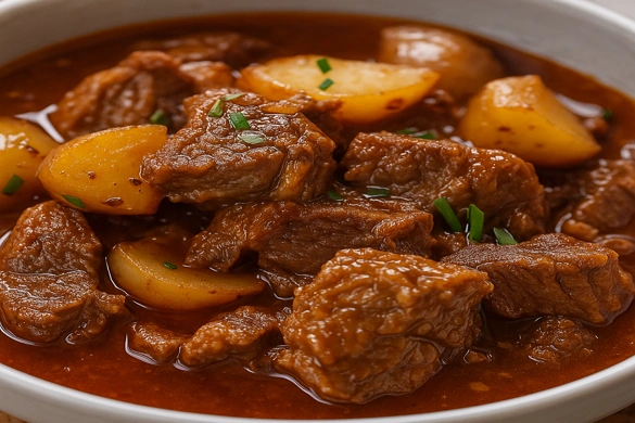 Classic Filipino Beef Mechado is a hearty Filipino stew made with tender beef chunks, potatoes, and carrots simmered in a savory tomato-based sauce with soy, garlic, and spices. Perfect for comforting family dinners and meal prep.