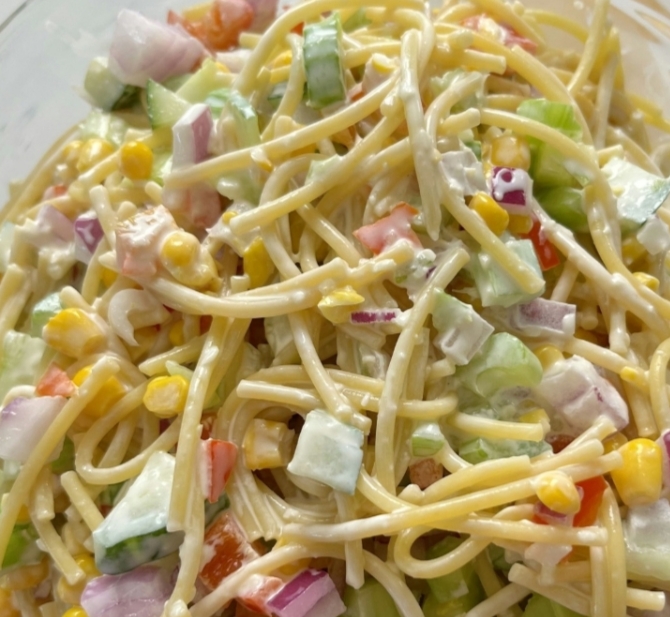 Confetti Salad 🎉There’s just something special about a creamy pasta salad—it’s nostalgic, refreshing, and always a hit at potlucks or family gatherings. This Confetti Salad lives up to its cheerful name, with vibrant veggies, tender pasta, and a tangy, creamy dressing that ties it all together. Whether you’re packing it for a picnic, serving it at a cookout, or meal-prepping for the week, this salad is both festive and flavorful!IngredientsSalad:1 (16 oz) package spaghetti1 red bell pepper, diced½ red onion, diced1 large cucumber, diced3 celery stalks, diced1 can whole kernel corn, drainedDressing:½ cup mayonnaise¾ cup sour cream½ cup grated Parmesan cheese1 tbsp white vinegar1 ½ tsp sugar1 tbsp Dijon mustard1 ½ tsp Worcestershire sauce1 tsp onion powder1 ½ tsp salt1 tsp black pepperInstructionsConfetti Salad 🎉There’s just something special about a creamy pasta salad—it’s nostalgic, refreshing, and always a hit at potlucks or family gatherings. This Confetti Salad lives up to its cheerful name, with vibrant veggies, tender pasta, and a tangy, creamy dressing that ties it all together. Whether you’re packing it for a picnic, serving it at a cookout, or meal-prepping for the week, this salad is both festive and flavorful!IngredientsSalad:1 (16 oz) package spaghetti1 red bell pepper, diced½ red onion, diced1 large cucumber, diced3 celery stalks, diced1 can whole kernel corn, drainedDressing:½ cup mayonnaise¾ cup sour cream½ cup grated Parmesan cheese1 tbsp white vinegar1 ½ tsp sugar1 tbsp Dijon mustard1 ½ tsp Worcestershire sauce1 tsp onion powder1 ½ tsp salt1 tsp black pepperInstructionsMake the dressing – In a small bowl, whisk together mayonnaise, sour cream, Parmesan, vinegar, sugar, Dijon mustard, Worcestershire sauce, onion powder, salt, and black pepper until smooth.Cook the pasta – Break spaghetti into 1–2 inch pieces. Boil until al dente, then drain and let cool for about 15 minutes.Assemble the salad – In a large bowl, combine cooled pasta with diced pepper, onion, cucumber, celery, and corn. Toss gently.Add the dressing – Pour dressing over the salad and mix until everything is well coated.Chill & serve – Cover and refrigerate for at least 1 hour to let the flavors blend. Serve cold and enjoy!Tips & Variations 🌟Swap spaghetti for rotini or penne if you prefer bite-sized pasta.Add extra crunch with diced carrots or chopped broccoli florets.For protein, stir in diced ham, chicken, or bacon bits.Lighten it up by replacing some mayo with Greek yogurt.✨ Colorful, creamy, and crowd-pleasing, this Confetti Salad is guaranteed to brighten up any table!