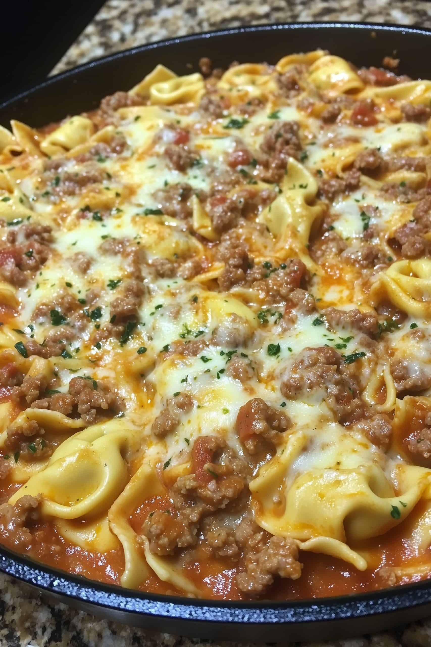 Top the tortellini with shredded mozzarella. If your skillet is oven-safe, place it under the broiler for a few minutes until the cheese is bubbly and golden. If not, keep it covered on the stove until the cheese melts.