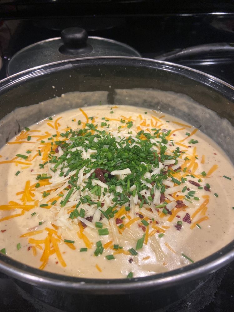 While this baked potato soup has a creamy texture, it does not include any heavy cream. I used whole (3%) milk, flour to thicken it, and a dab of sour cream in the end for flavor. I also chose not to bake the potatoes for this recipe. Techniques for creating this famous meal vary, but I find it easier to just get started on the soup and cook it all in one pot all at once. If I have a choice, I always go with the simplest alternative!