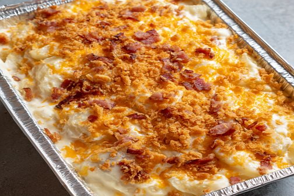 Layer the Casserole: Grease a disposable aluminum tray or a baking dish, and layer half of the sliced potatoes in the dish. Sprinkle half of the crumbled bacon on top, followed by half of the cheese sauce. Repeat the layers with the remaining potatoes, bacon, and cheese sauce.