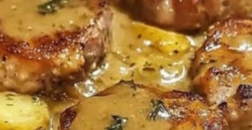 SMOTHERED PORK CHOPS WITH POTATOES IN GRAVY
