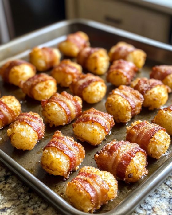 - Bake: Bake in the preheated oven for 20-25 minutes, or until the bacon is crispy and the tater tots are golden brown.
