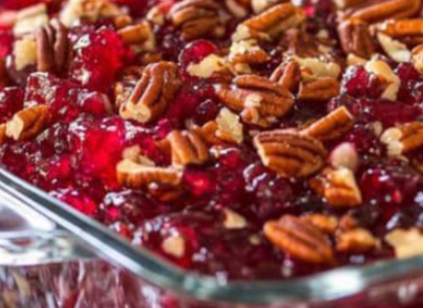 Wygląda na żurawinowy deser z galaretką i orzechami pecan (popularny zwłaszcza na święta). Oto sprawdzony przepis w wersji domowej 👇